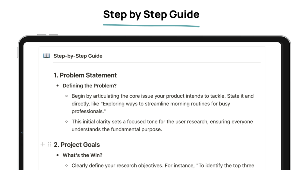 Kick-start user research with "π¦ User Research Kick-off" Notion template. Streamline planning and execution with a step-by-step guide, aiming for key user insights. Perfect for solopreneurs and startups, it prepares you for effective interviews and data analysis to align your product with customer needs.