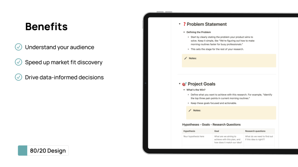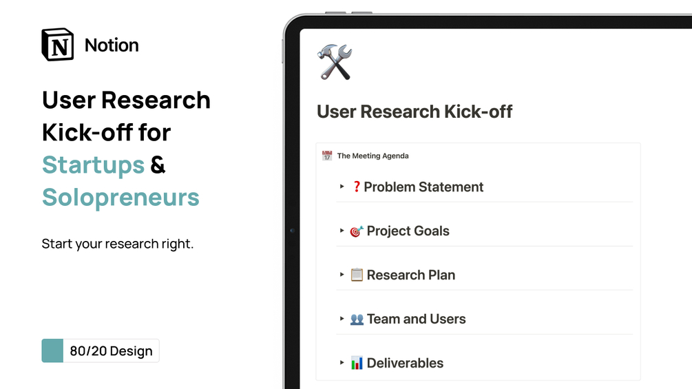 Dive into deep insights with the "π¦ User Research Kick-off," a free Notion template from 80/20 Design crafted to kickstart your user research phase with confidence. Including a "Step by Step Guide" + "Best Practices + Common Pitfalls to Avoid" π, this template is designed to streamline the planning and execution of your initial user research efforts. It's an essential tool for solopreneurs and startups ready to precisely explore their customers' needs, behaviors, and motivations. Part of the "Product Manual: Focus on What Matters" suite sets the foundation for product development that aligns with your users π±π.
